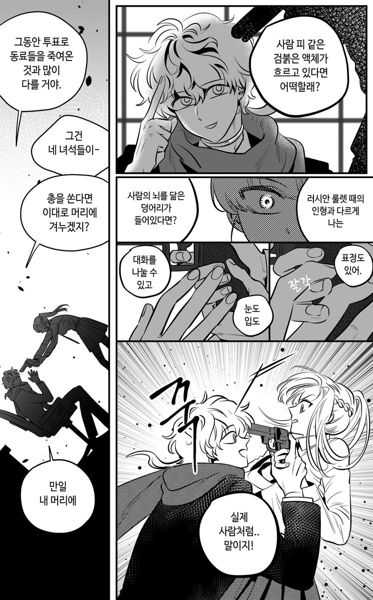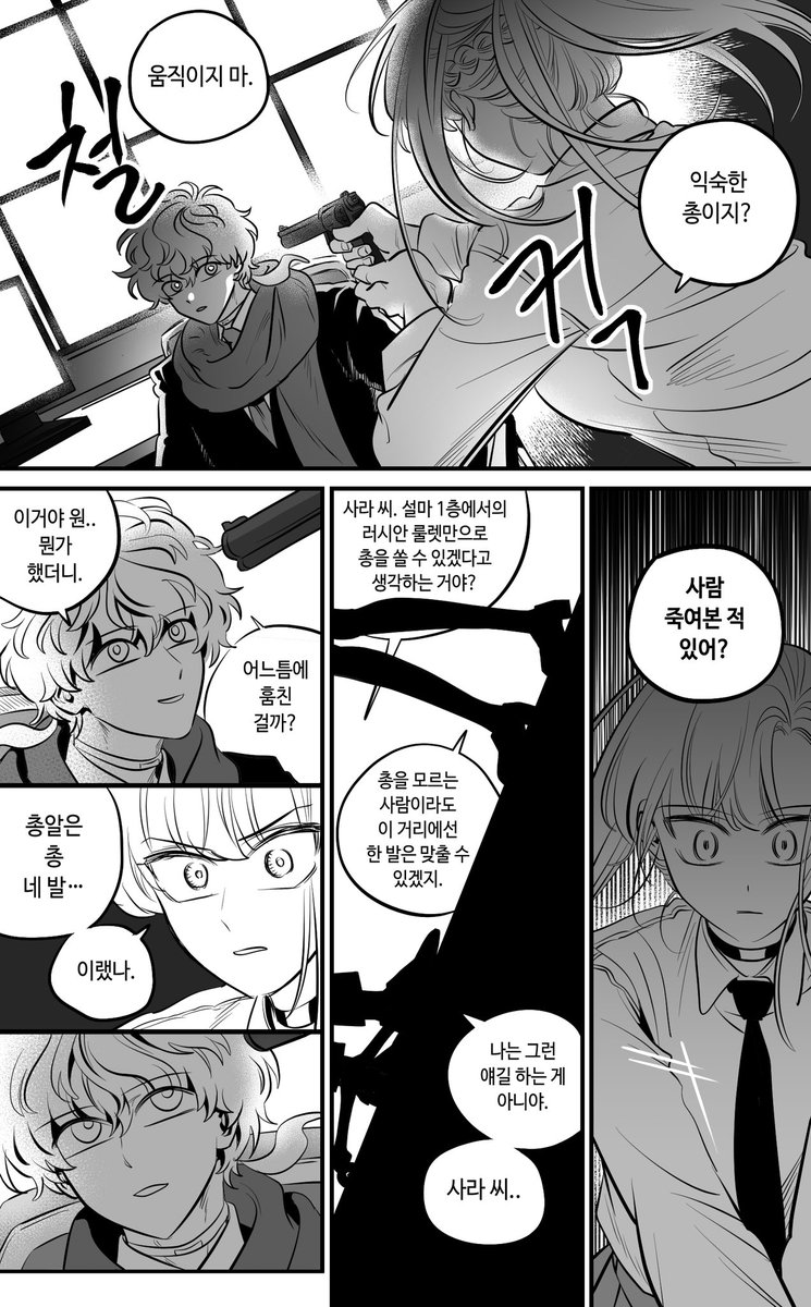 미도사라 (4/8) 사라가 미도리의 총을 훔쳐서 쓰는 만화 ⚠️폭력적인 장면과 피가 등장함 그린 사람이 총을 잘 모릅니다