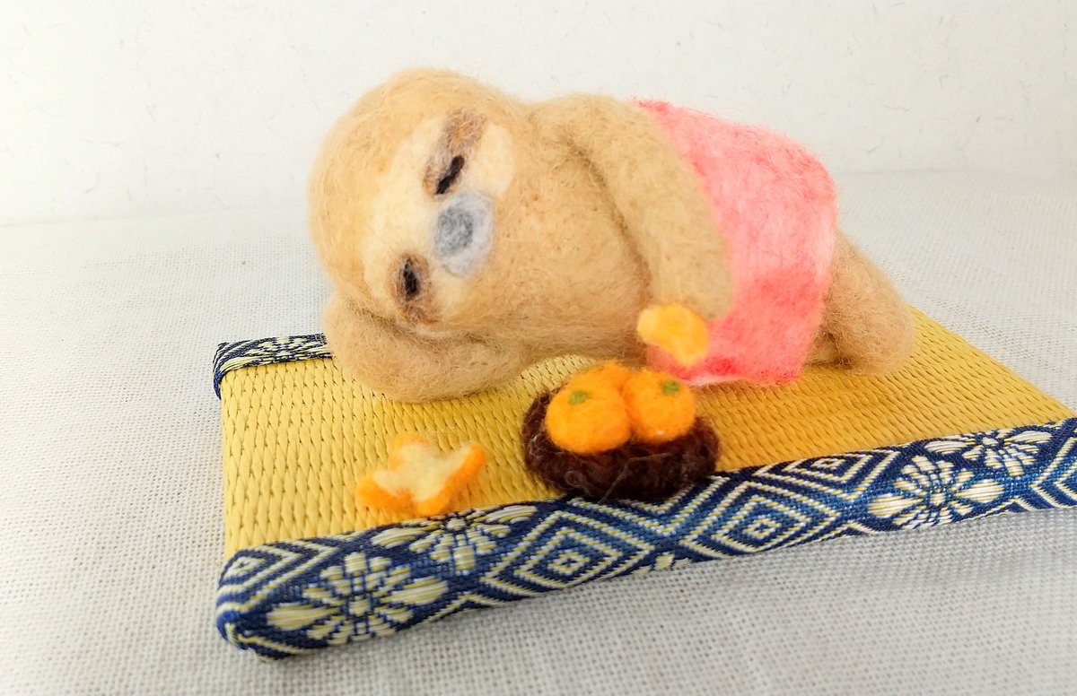ひさしぶりのナマケモノ作品🦥 冬休みのナマケモノです 畳の上でゴロゴロしながらみかん食べてます🍊 寒いからタオルをかけてるそう❄ やっぱりナマケモノ作るの楽しいなぁ♡ #羊毛フェルト #ナマケモノ #みかん