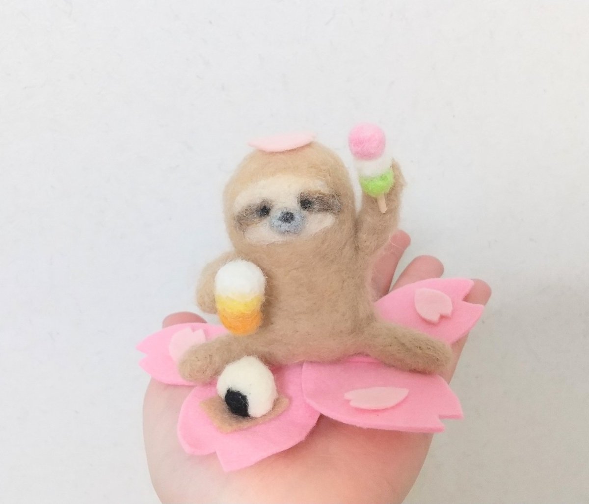 14 56 お花見のナマケモノさん🦥🌸 ビールとお団子持たせてみました🍡 飲むぞ~、ひゃっほ~って言ってそうです😂 お天気よくなったら写真撮りたいなぁ #ナマケモノ #羊毛フェルト #お花見 #桜 22/03/26 15:32