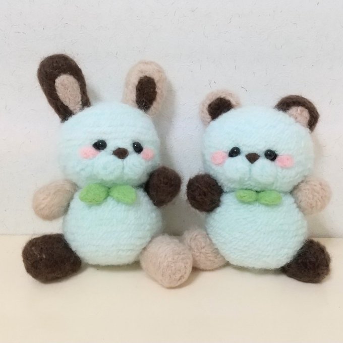 17 71 うさぎさんにお友達ができました ぽてぽてチョコミントのぽてっとしたくまさんです🧸💚 仲良くしてあげてね𓂃𓈒 𓂂𓏸 #チョコミント #チョコミン党 #羊毛フェルト #くま 22/07/17 14:24