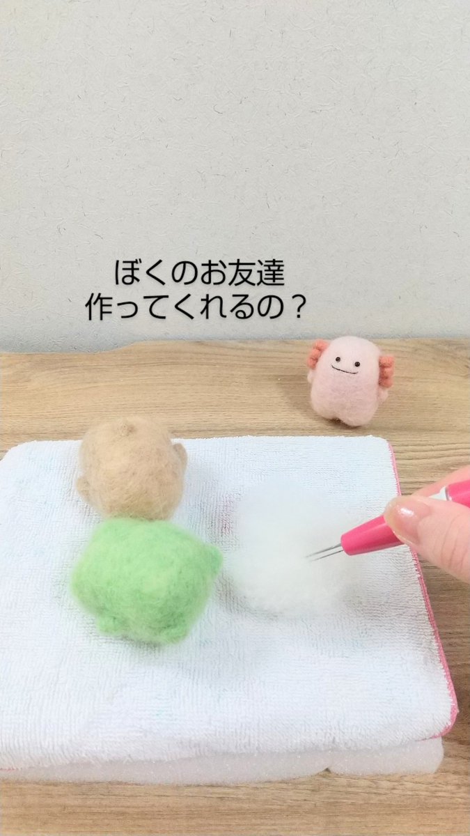 なんだかすごーく視線を感じます…꒰( ˙𐃷˙ )꒱ 見つめられながらウーパー君のお友達を作ることにしました💭 なにになるかわかるかな~ #ウーパールーパー #羊毛フェルト