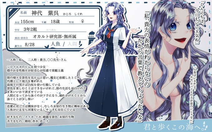 こちらの企画様(@Toko_s_TL )に参加させていただきます。弱視の楽観主義人魚です。仲良くしていただけたら嬉しいです!よろしくお願いします。 #とこ海_CS #とこ海_生徒 #とこ海_人魚 #とこ海_オカルト研究部 #とこ海_3年