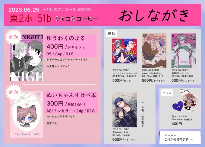 13 24 6/25 兵摂オンリー 十万回のアンコールのおしながきです。 よろしくお願いします🙇♀️ pixiv.net/artworks/10925… 23/06/23 00:36