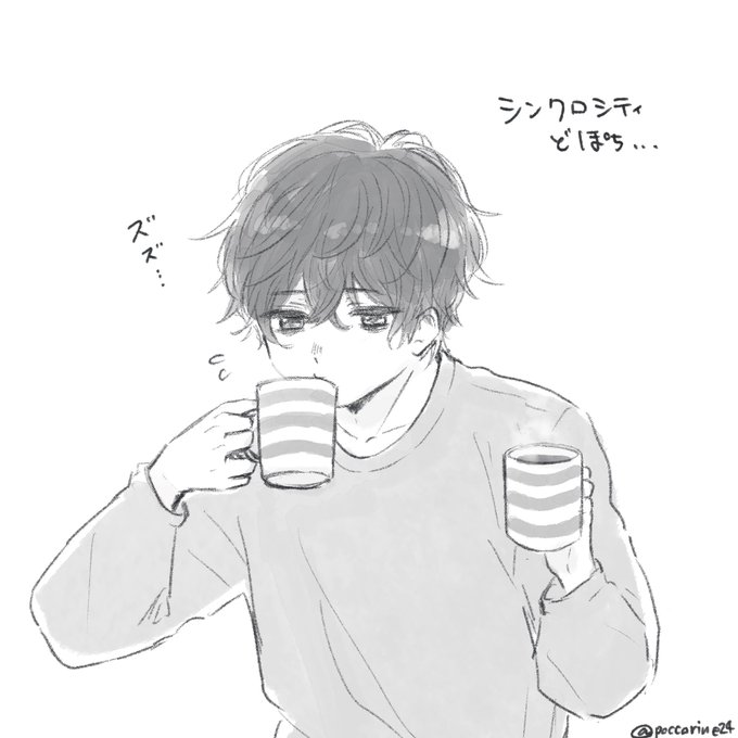 87 664 癖で入れた2杯分のコーヒーをやむなく1人で飲む👔ちんの絵です。 22/06/16 00:36