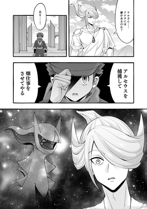 ※※アルセウス/ネタバレ注意※※ 例のシーンでテル(主人公)とウォロが夢を語り合う漫画です。