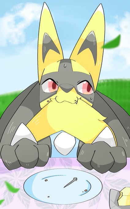 サンドイッチ1人で食べちゃってなぜか尻尾を咥えてごまかそうとするうちのルカリオ #ポケモンイラスト