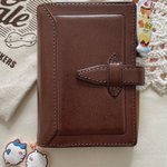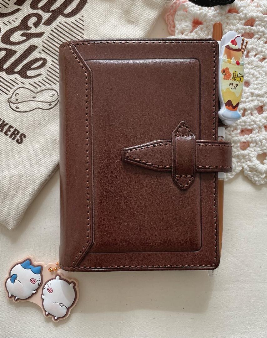 私のお気に入り、手の平サイズのm5手帳☺️ロロマクラシック(お色はダークブラウン)さんを擬人化して描きました(´-ᴗ-⸝⸝ก) すぐ擬人化したくなる病気です。 手帳の下の毛糸作品はリノセロスちゃんの作品。これさえあれば何でも映える✌🏻 #illustration #Procreate #originalcharacter
