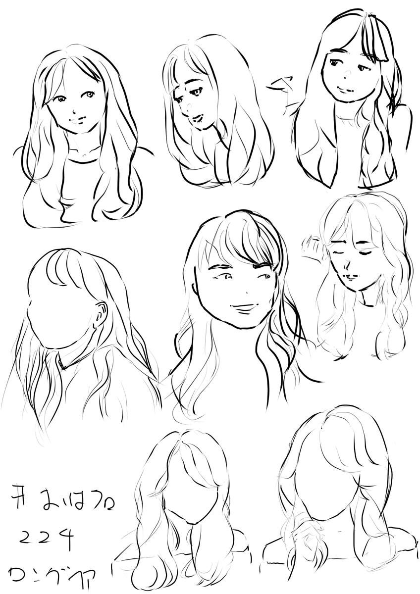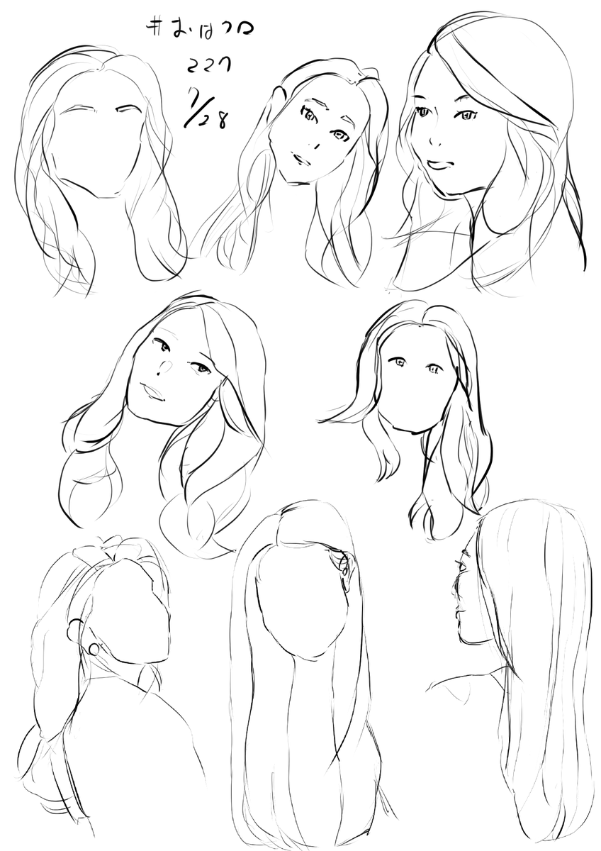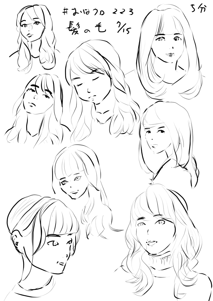 #おはクロ 223に参加させていただきました。 昨日よりは髪の毛の束で描けるようになった気がする。 はじめの2,3枚は直線多めを意識して描くようにして、その後はあまり気にせず描くように試してみました。 ありがとうございました。