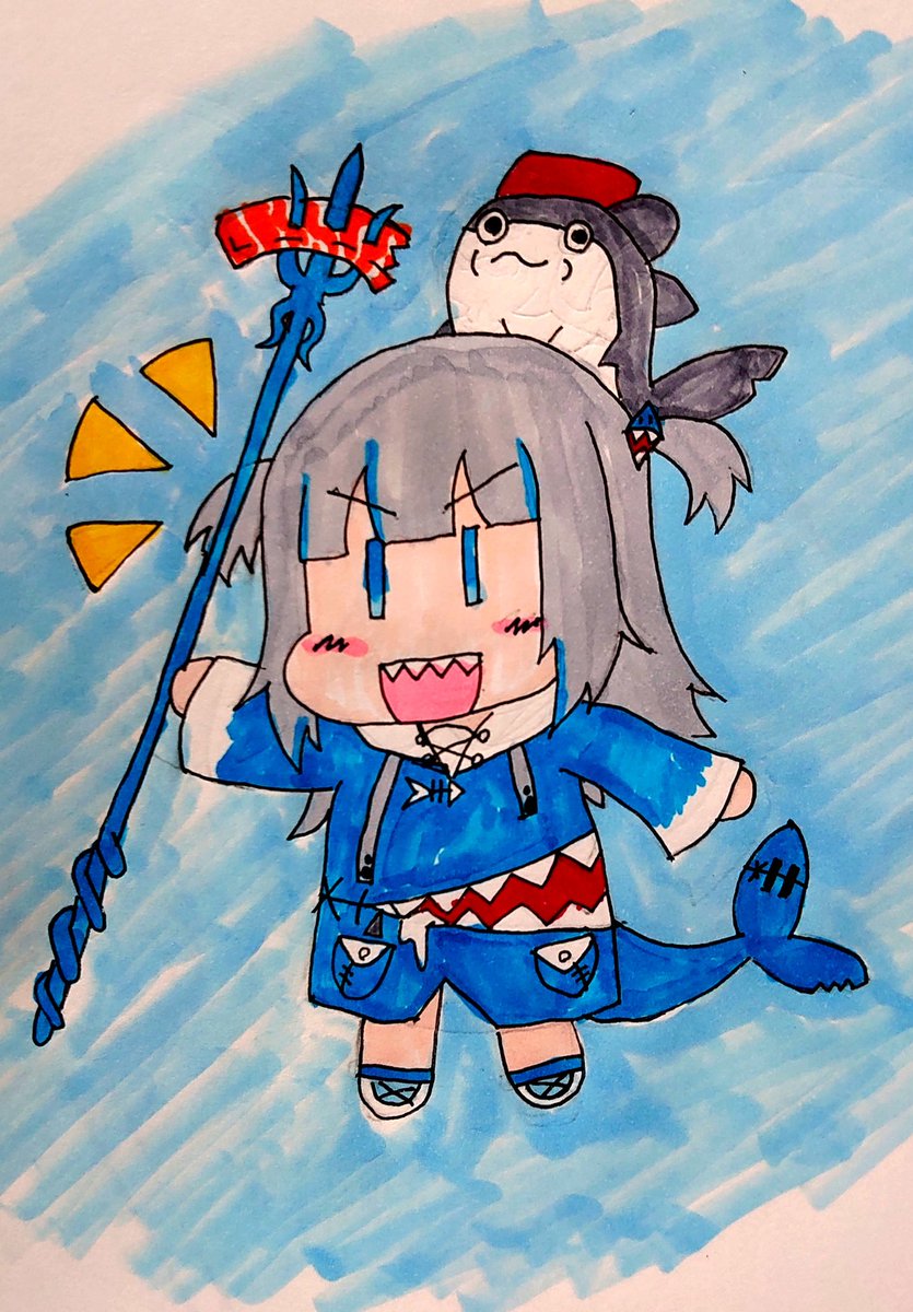 ぐらちゃん描いてみた。 遅くなったけれど、100万人おめでと〜う ん?刺さってるのもの?これはサーモン、イイネ? #gawrt