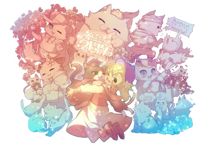 祝!大陸の覇者 2(にゃん)周年 支炎獣の登場が嬉しくて大好きなキャットリンズと猫達でお祝いを。 旅路で猫が一緒に走って戦って懐いてくれるなんて夢のようです。実現して下さった鈴Pとスタッフの皆様に深く深く感謝を! #オクトラ芸術の覇者 ・イラスト部門 #オクトラ周年祭 #オクトラ大陸の覇者