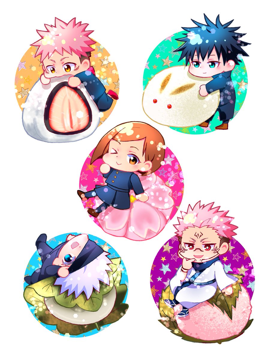 和菓子の子達できました〜☺️ 悠仁くんいちご大福、恵くんうさぎ饅頭、野薔薇さん練り切り(さくら)、五条悟柏餅、宿儺様桜餅です💕