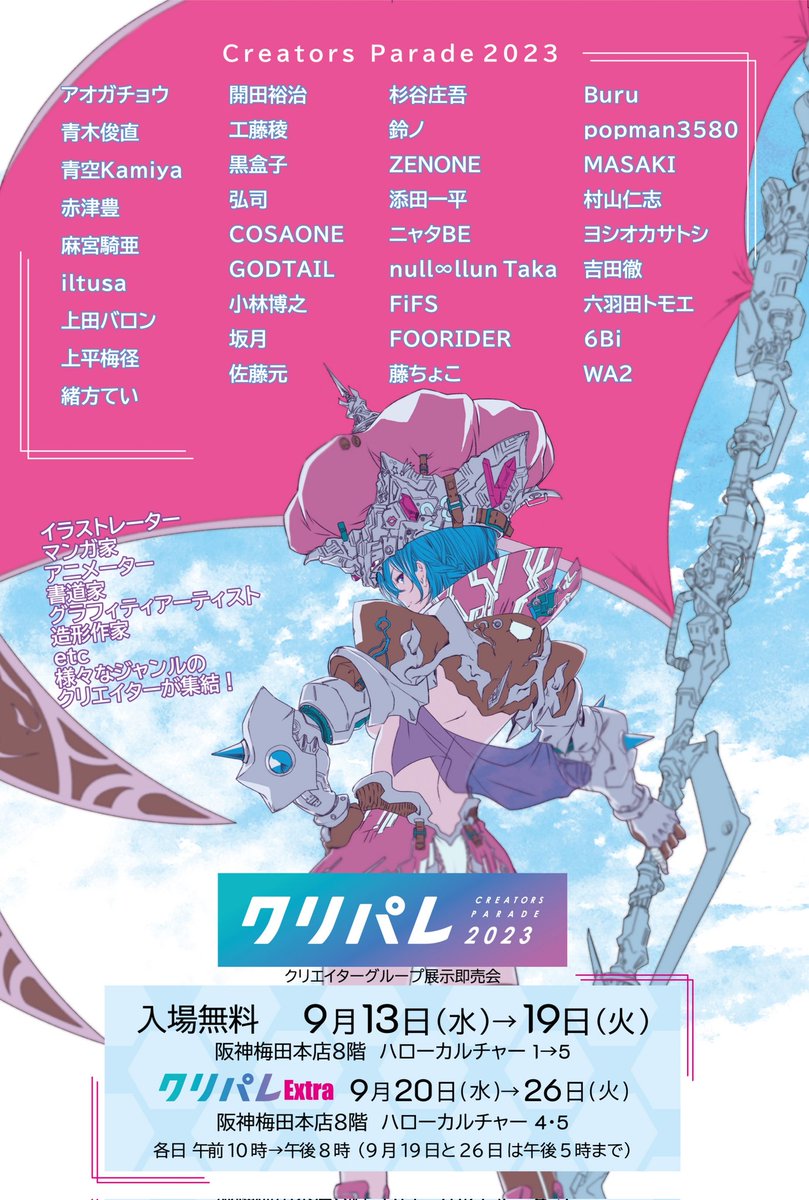 はーい 9/13~9/26 阪神梅田本店様にて 開催される 展示即売会 クリエイターズパレード2023に 参加させて頂きます 何枚か描き下ろしの イラストが展示されるので 皆さんよろしければ ちょっと覗きに来てね #クリパレ2023