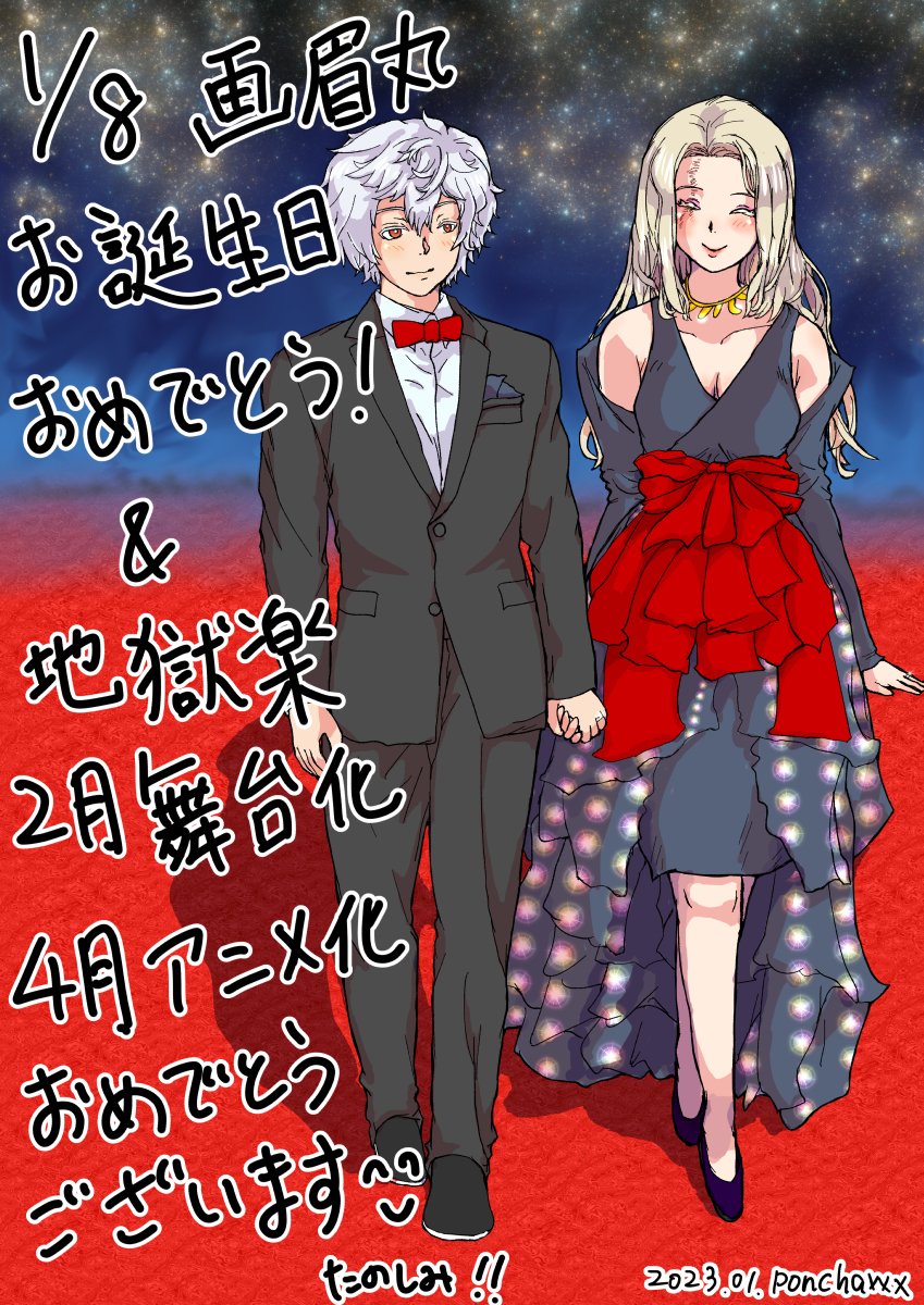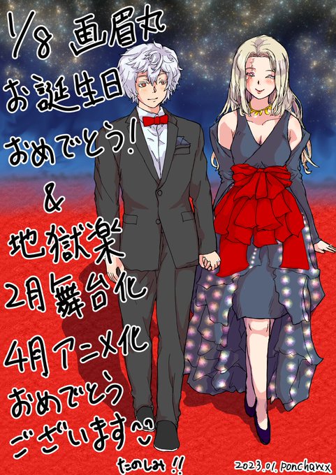 画眉丸、誕生日おめでとう🎉 今年一枚目のハピバ絵は我らが主人公、画眉丸です。 今年は地獄楽イヤーなので、画眉丸には奥様とレッドカーペットを歩いてほしかったのです。今日は久しぶりに入稿日当日のヒリヒリを味わいました… #地獄楽ファンアート #画眉丸誕生祭2023 #画眉丸生誕祭2023 #地獄楽