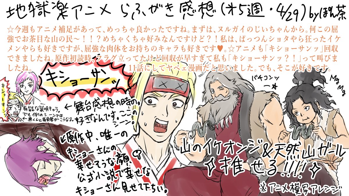 第5話の #地獄楽アニメ の感想絵です。今回は事情があり1日遅刻💦も🌰で監視されてないとダメですね。いつもらふがき感想を見て頂き、ありがとうございます。今週も好きな場面いっぱいでした。1カットでも推しの付知くん出してくれてありがとう、ツインエンジン様、MAPPA様♥#地獄楽ファンアート