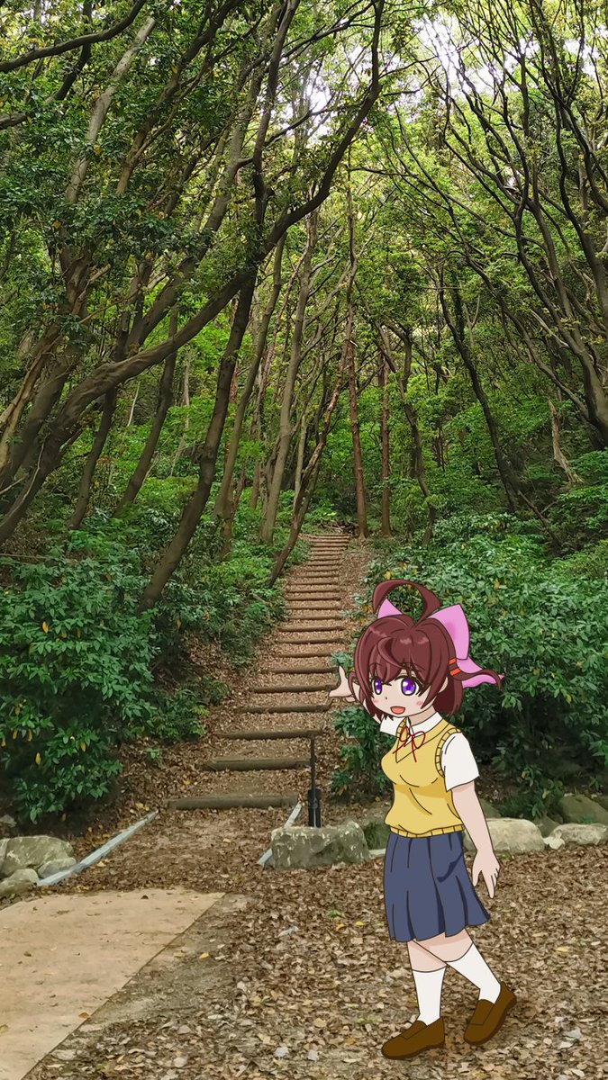 なちょこ旭丘分校ver 猫背で大根足になっちまった許せw なもり神がちょい前に連発してた実写背景にキャラ描くのやってみた。 #なちょこ #なちょあーと