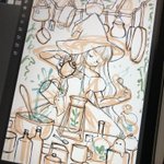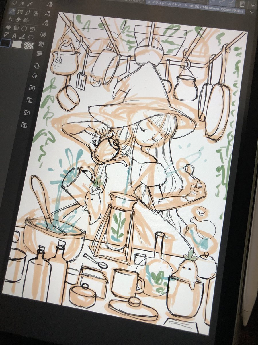 #ルーレットで絵を描こう ②魔女×水×緑 ラフ案までで限界〜!💦と2回目にしてやっと悟りました←遅い😂 描く速度が🐢過ぎてもぅ〜💦 でも楽しんで描くのが目的ですもんね💕凄く楽しいです🎶 室内で帽子?と水が少し強引ですけど好きな感じになりました♡ 後に作品としてもちゃんと仕上げますー☺️💖