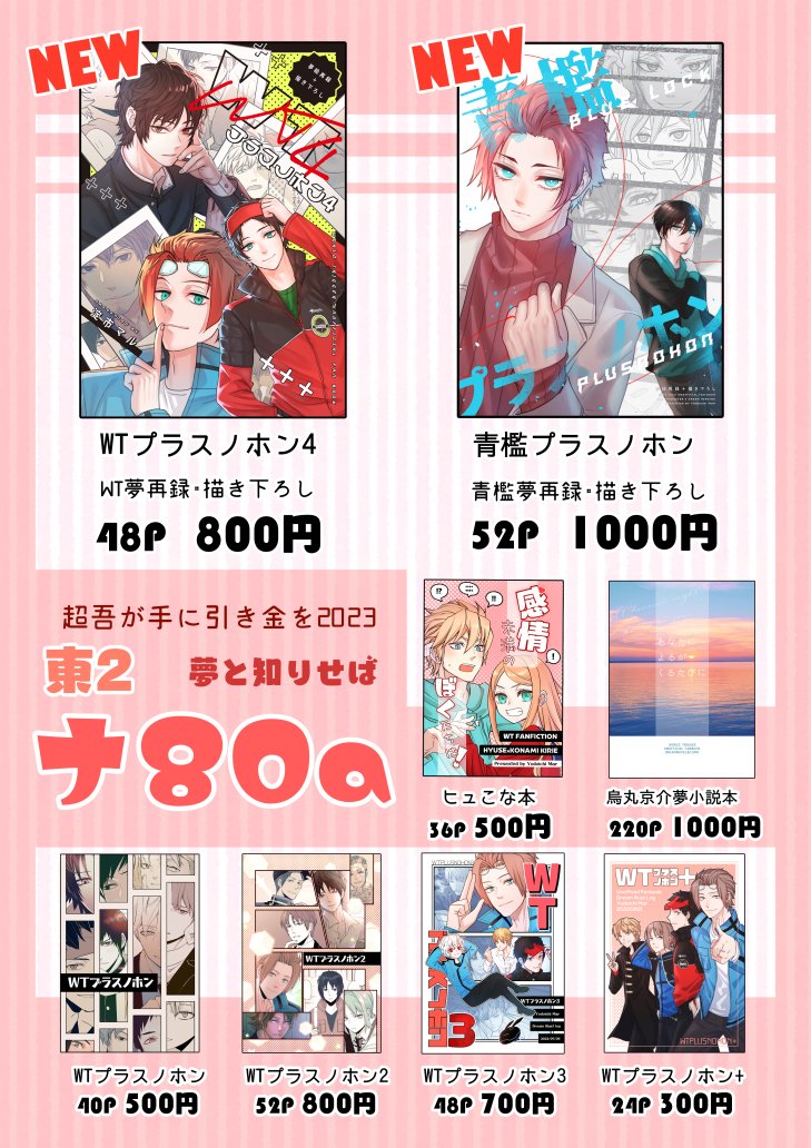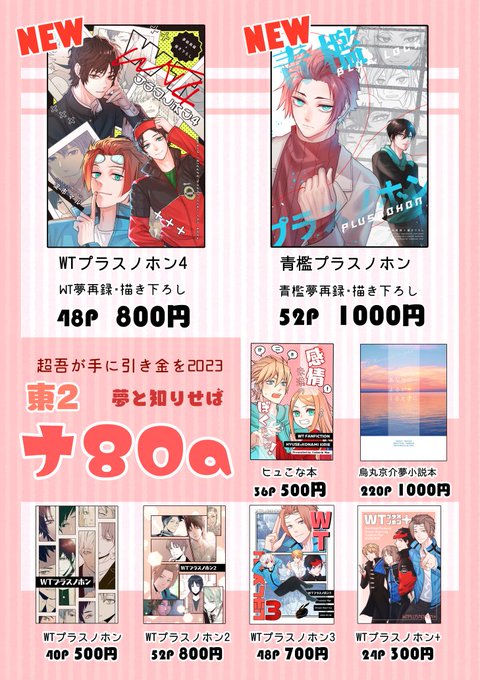 【イベントお知らせ】 5/4超吾が手/東2ホール/ナ80a お品書きとサンプルです。 新刊のWT夢本と青檻夢本、既刊のヒュこな本にはちょっとしたノベルティがつく予定。 【pixiv】pixiv.net/artworks/10741…