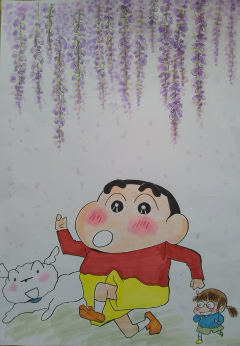 0 12 藤としんちゃん&シロイラストです!ちゃっかり手書きPOP屋もいますヽ( ̄▽ ̄)ノ ↓ ameblo.jp/popkakimasu/ #クレヨンしんちゃん #藤の花 #水彩画 #イラスト 22/05/08 01:56