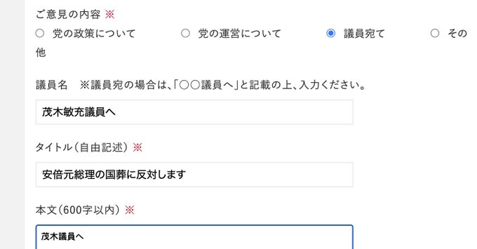 #安倍晋三の国葬に反対します 自民党のご意見ページには、議員宛ての項目があります。茂木議員は国民の声が聞こえてないみたいなので、茂木議員宛にメッセージを送ってあげましょう。 ssl.jimin.jp/m/contacts