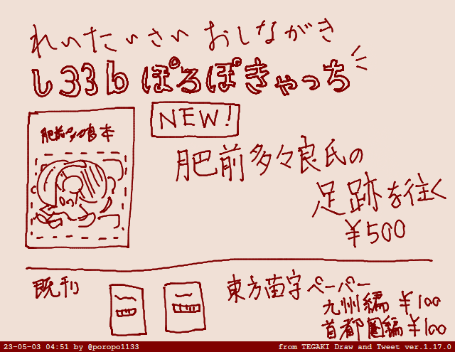 58 110 【告知だよ】5月7日例大祭20の新刊です。 「君は肥前多々良氏を知っているか」 偶然出会った『多々良家系図』という本に感銘を受けて現地に行った紀行物っぽい本です。去年出した小まとめ2つを1冊に再構成しました。 肥前多々良氏の足跡を往く/24P/500円 【し33b】でお待ちしております。 23/04/30 15:12