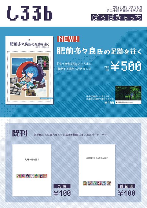 13 22 【し33b】ぽろぽきゃっち #例大祭20 のお品書きです。 当日はよろしくお願いします。 新刊サンプルは引用元にて! twitter.com/poropo1133/sta… 23/05/03 17:38