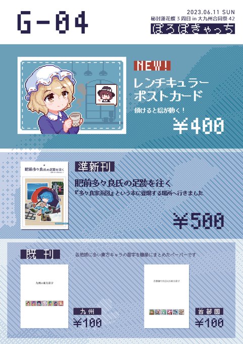 明日の大九州合同祭42内、秘封蓮花蝶のお品書きです 新作のポストカードに加えて準新刊が九州初頒布になります 【G-04】ぽろぽきゃっち にて!