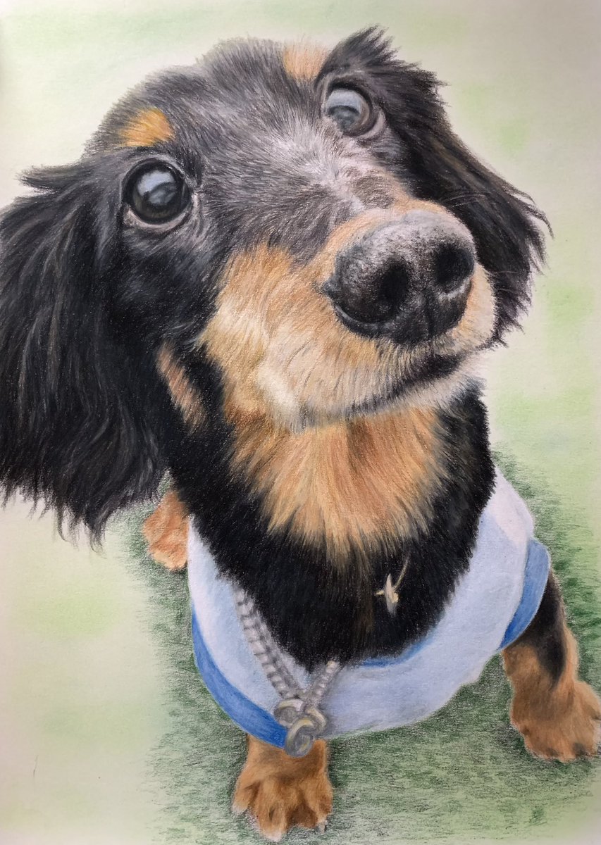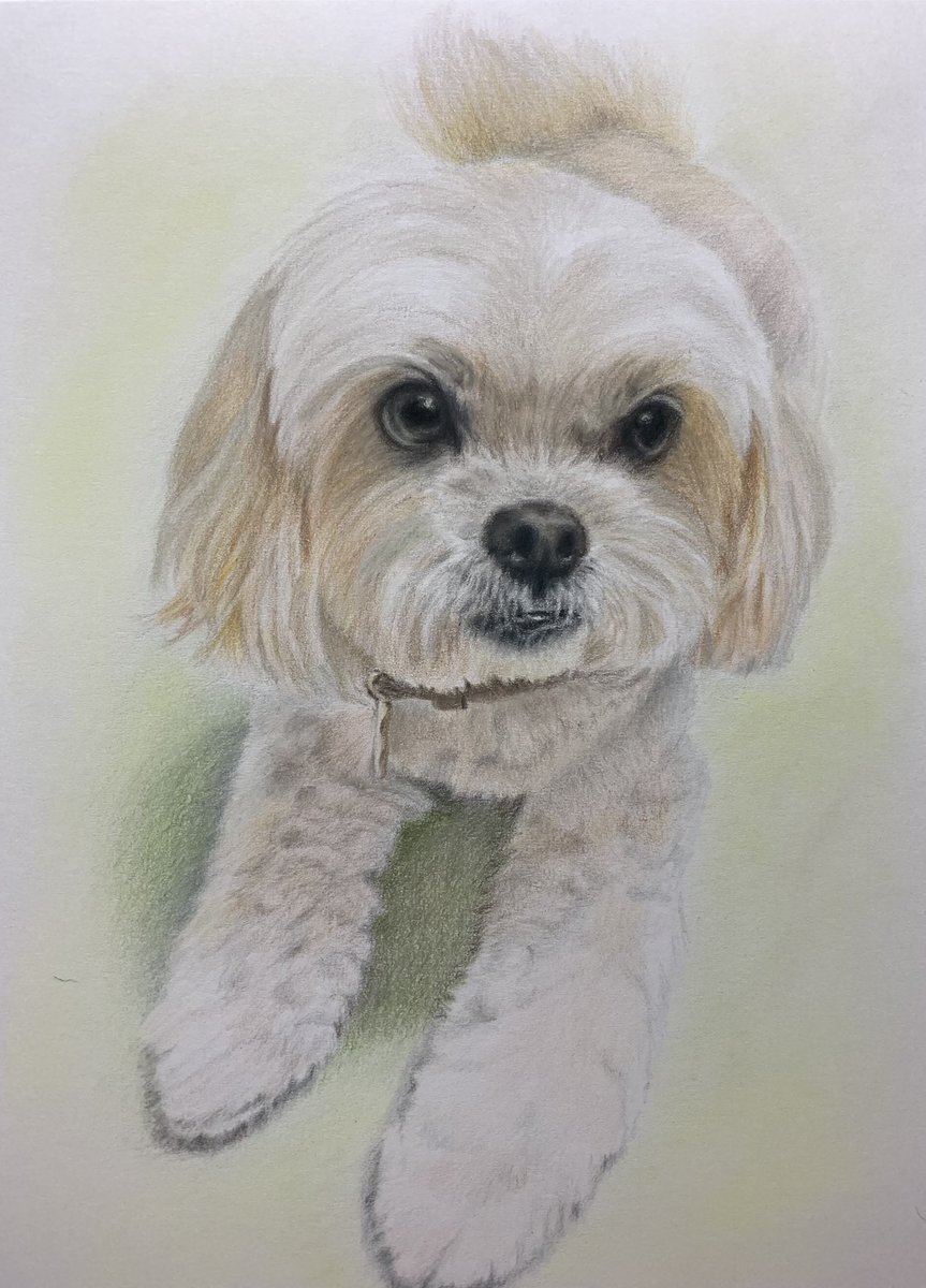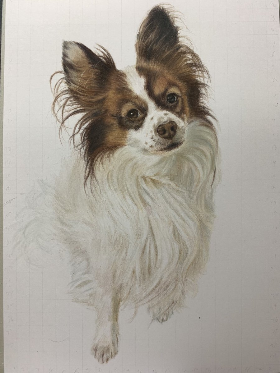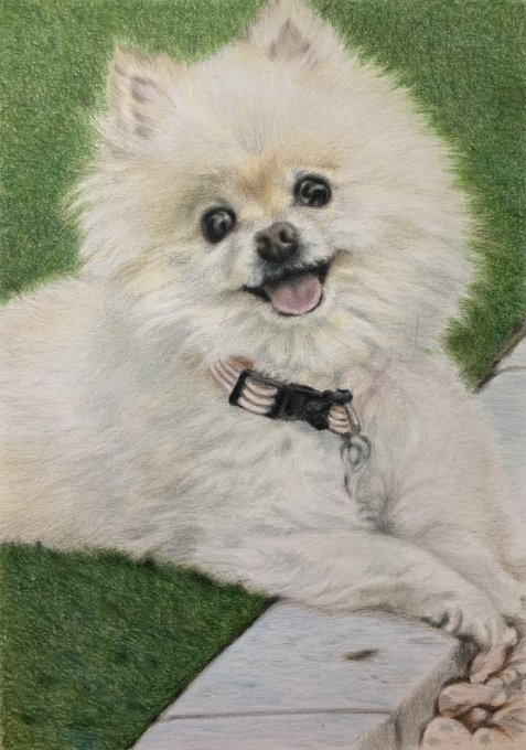 わんこ出来たー‼️ 背景塗りで肘やられてまーす😂 #色鉛筆画