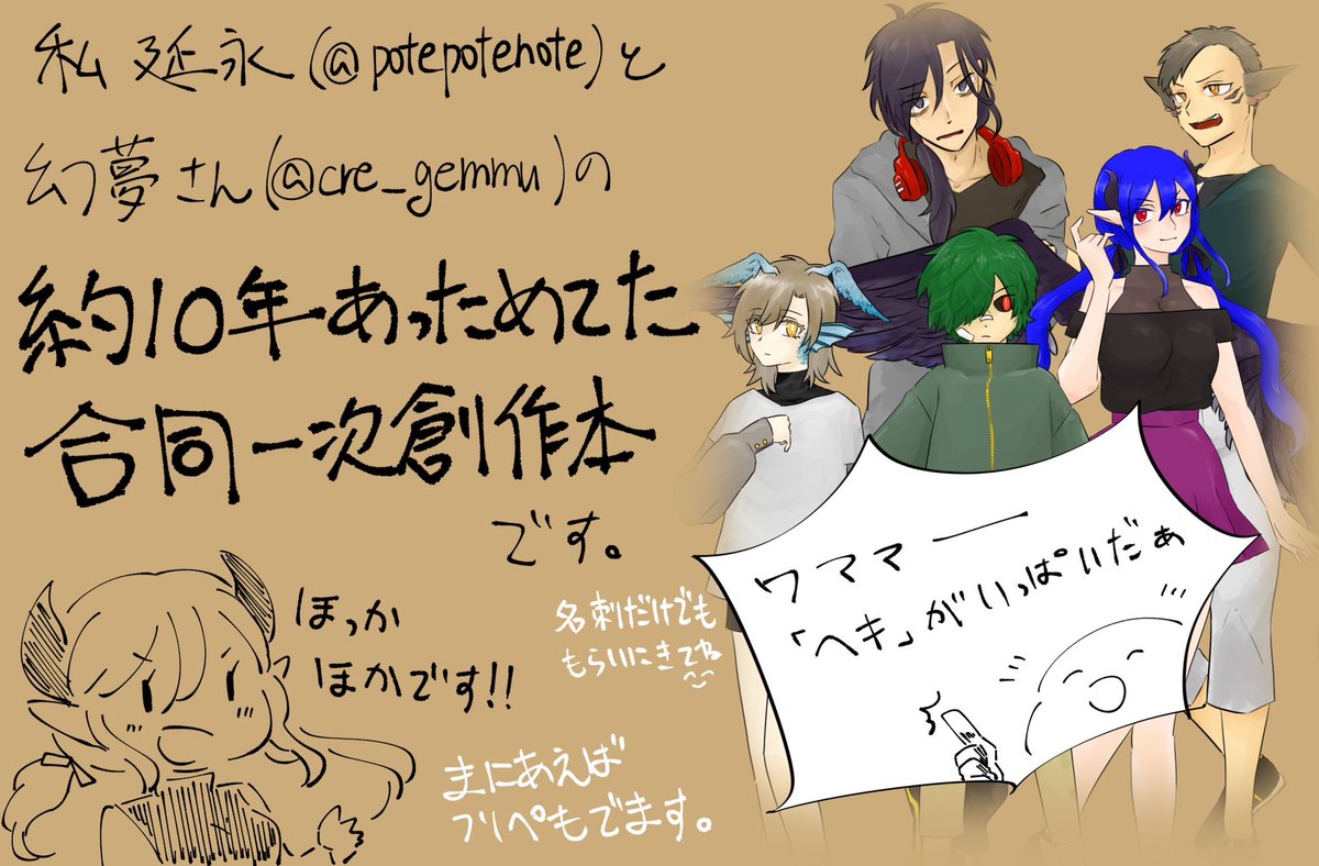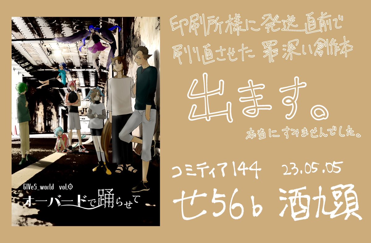 3 5 #コミティア144 うおー!!いよいよ今日です!! せ56b 酒九頭 じぇんそいさんのスペースに委託しております。 開始30分くらいは私が店番してます。 私がブースにいるときなら、スケブ(ポストカード)もやろうかなと思ってますので、よかったらぜひぜひ!! 昨日描き終わって印刷した無配もあるよ! 23/05/05 08:12