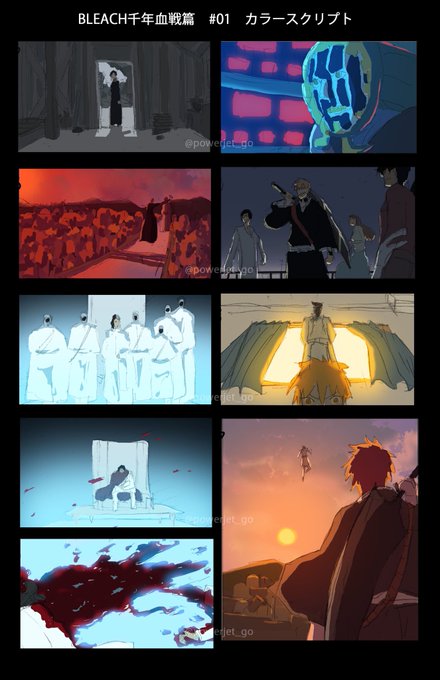 BLEACH千年血戦篇、カラースクリプト抜粋。イーバーン登場シーンの逆光は美監の谷岡さんがより仰々しくしてくれて面白い画面になったと思います😃雀部さんの隊葬シーンはモルゲンロートをイメージしてます。