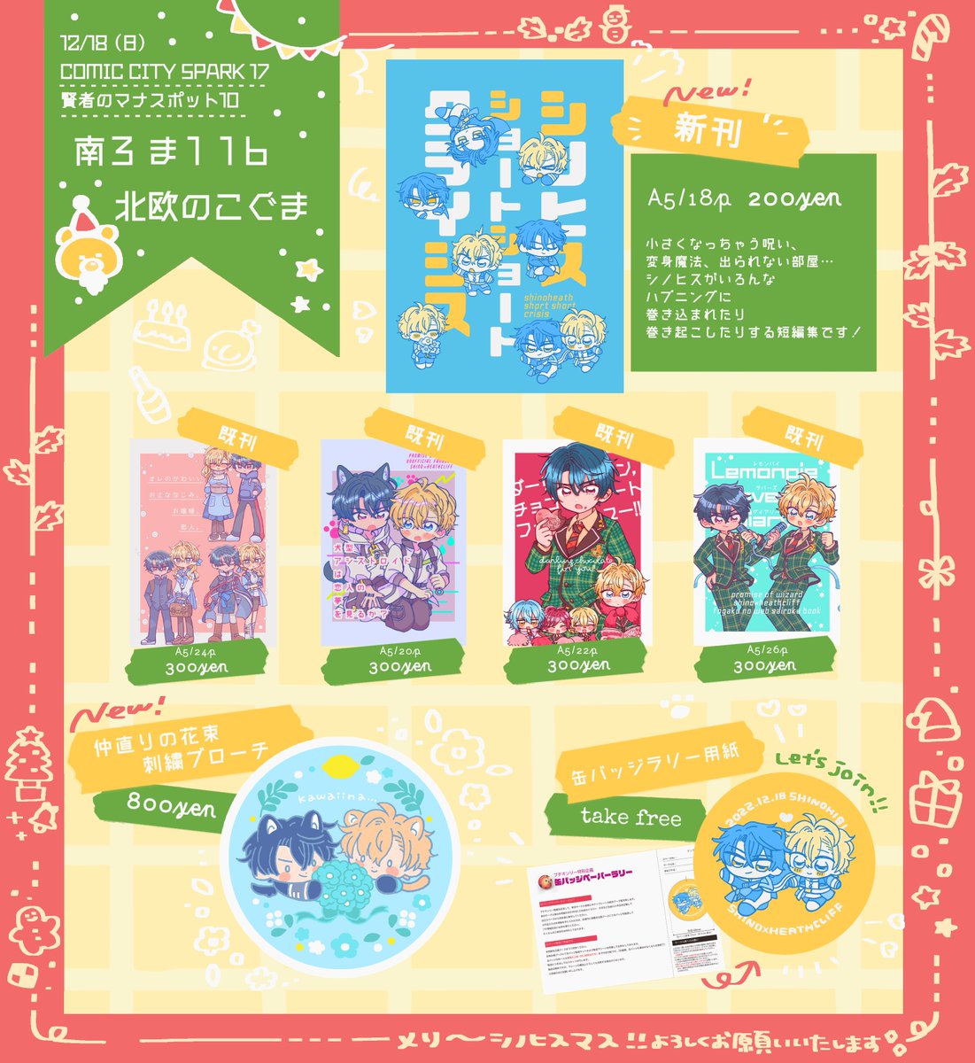 12/18賢マナ10内 しの日々2お品書き✏️ 明日はどうぞよろしくお願いいたします🎅🏻🌿🍋 シノヒス既刊への各リンクはpixiv上にまとめています!▽ pixiv.net/artworks/10366… twitter.com/poya_kuma/stat…