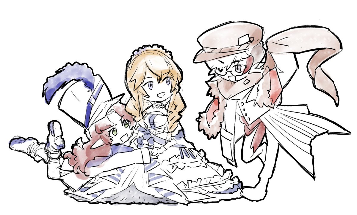 サイラッハ実装記念に前から描きたかったエリジウム・テンニンカとの旗手3人のらくがき この3人は並べるとこう…でずに~ぷりんせす感あるなぁと思いますね…