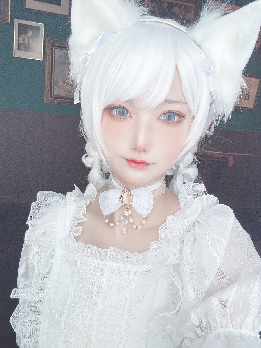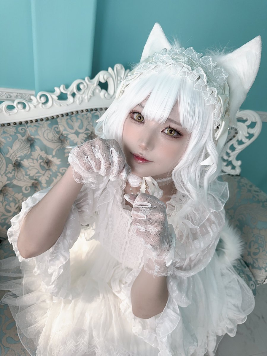 てるさんと創作白猫ちゃん撮影してきた🤍 衣装プロデュースまでしてもらって🥹💘激カワでした😭😭😭最高😭 2パターンしてきたけど雰囲気違う感じにできて良き! 長毛ちゃんはリボンみつあみ🎀にした〜!可愛くできて満足満足🫶