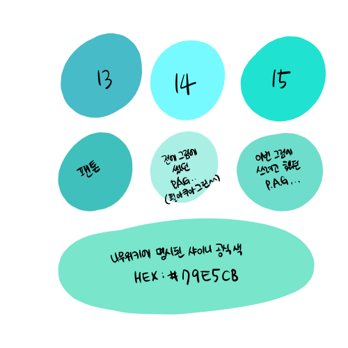아까 '펄 아쿠아 그린의 50가지 그림자'가 웃겨서.. (왜냐면 나도 대충 적당적당히 색 골라서 쓰기 때문에😂) 민트색을 모아봤다 혹시 몰라 찾아보니 장작위키에 샤이니 공식 색이 헥스 코드로 #.79E5CB 로 명시되어 있었다. (출처는 모른다)(근데 앞으로도 대충 골라서 쓸 것 같다..머쓱ㅋㅋㅋ)