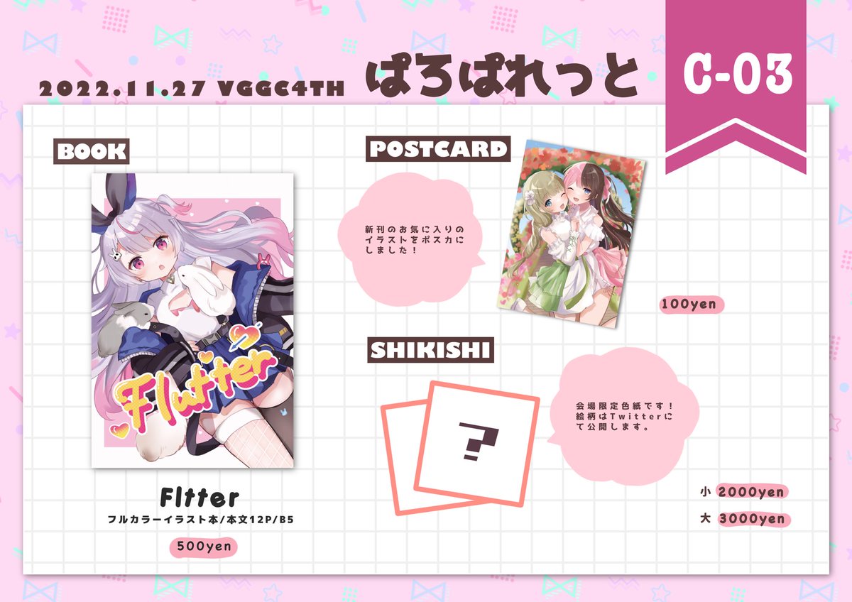 11/27(日)開催の【VGGC4th】のお品書きです!ミミすみれうるはちゃんメインのイラスト本とはなばなちゃんのポスカと色紙を頒布します!色紙の絵柄は明日公開します! 【C-03】でお待ちしております❕🤍 是非遊びに来てください!!!#VGGC