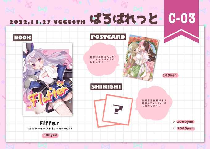 89 181 11/27(日)開催の【VGGC4th】のお品書きです!ミミすみれうるはちゃんメインのイラスト本とはなばなちゃんのポスカと色紙を頒布します!色紙の絵柄は明日公開します! 【C-03】でお待ちしております❕🤍 是非遊びに来てください!!!#VGGC 22/11/25 19:52