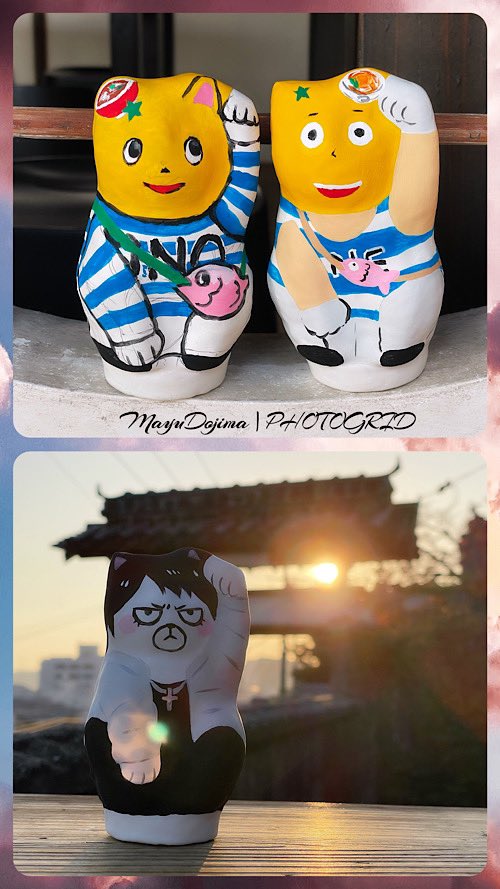 4 23 尾道で招き猫絵付体験をしてきた!姉が小野ミチオ君、私は偽ミチオ描いたんだけど、めっちゃ難しかったwww あともう一個は猫大吾描いたよ〜💖スーツにオールバックのと悩んだけど、こっちのが猫にしやすそうだったんで若大吾にした🐱💕 22/11/18 21:10