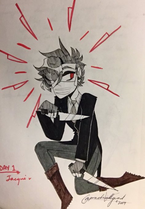 day 1: knives + jacqui i dont got a prompt list so im just going with my own.... lol.... eventually ill do some spooks and gore but for now its my boy jacqui :-) #Inktober2019