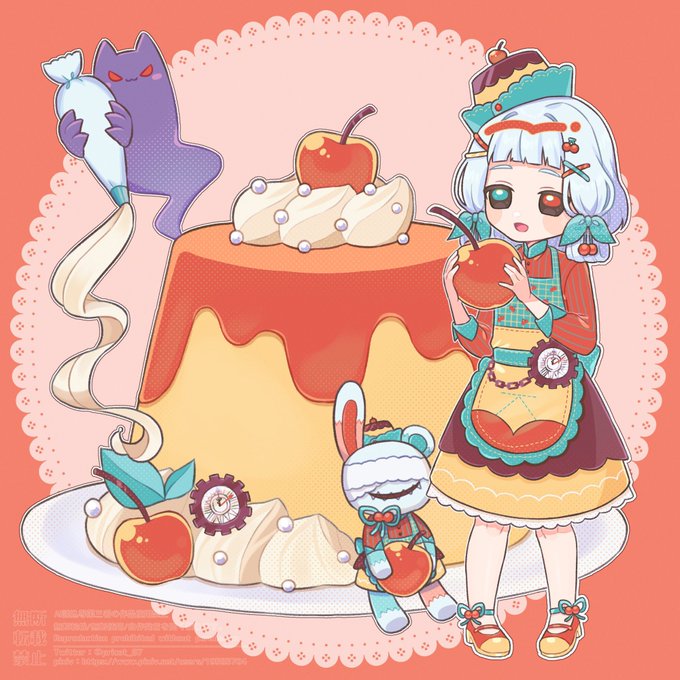 #コクリコとパティシエごっこ きいりさんの企画に参加させていただきました! 🍒×🍮モチーフのコクリコちゃんです🍽 タグから他参加者の方の素敵なコクリコちゃんたちが見られるので是非〜!!