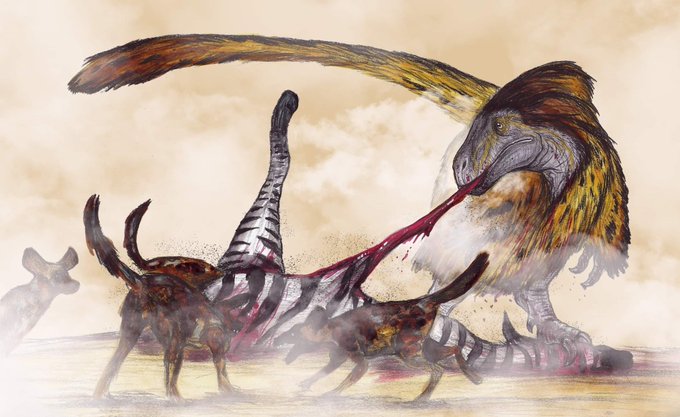 Artwork by @Emily_Art based on the chapter 'Nyoho Ongongo' from Primitive War II - Animus Infernal. The Mother Gaia carcharodontosaurus faces off with Xipetotec's citrinitas and caudapavonis packmates. Available now on amazon! #primitivewar #paleofiction #paleoart #dinosaurs