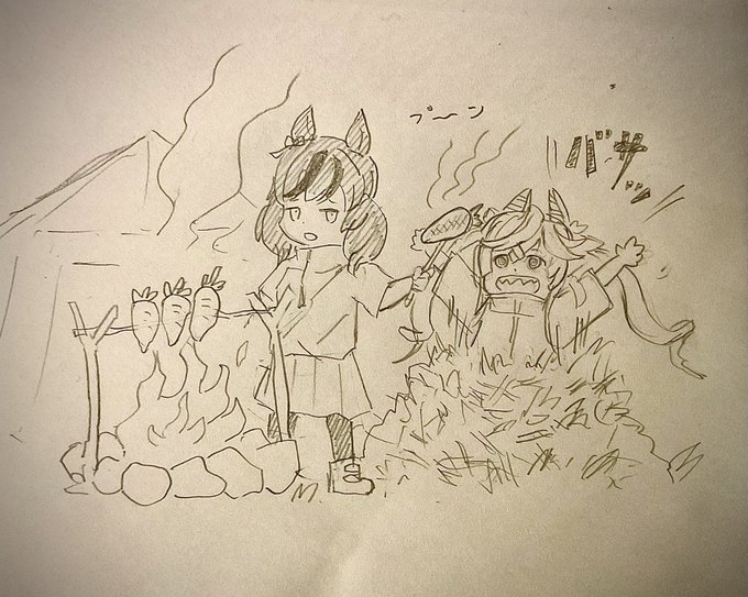 2 4 #ウマ娘版深夜のお絵描き60分一本勝負 お題 ウマ娘のキャンプ キャンプで涼みたいな〜お腹空いた #ナイスネイチャ #ツインターボ 22/07/06 04:24