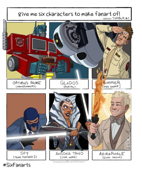 Took requests over on tumblr. #SixFanarts #6fanarts #6fanartschallenge #Transformers #Portal #RedDwarf #TeamFortress2 #TF2 #StarWars #GoodOmens
