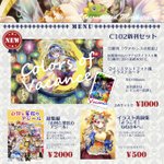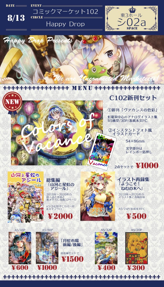8/13 #C102 お品書きです 虹龍洞中心のアナログイラスト集と飯綱丸さまのブロマイドの夏コミセットを頒布します カードビジネスの始まりから破綻までを描く月虹市場前後編、例大祭で頒布した総集編も持ち込みます 【2日目東3ホール シ02a Happy Drop】にて頒布します よろしくお願いいたします!