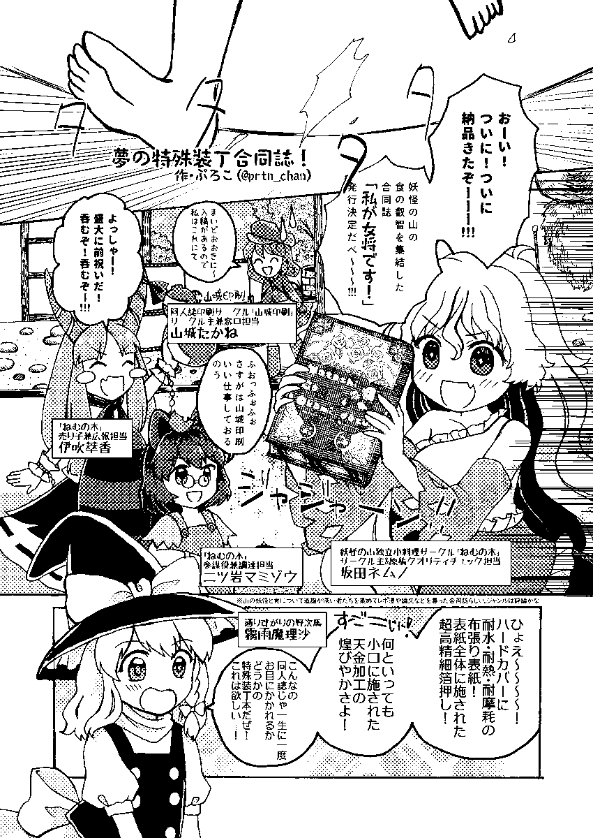 同人誌即売会幻想入り合同『あの賑やかな即売会は今ここに』に漫画を4p寄稿させていただきました 8/13 #C102 【東3ホールシ02b ガノデルマ】 にて頒布です 続きはぜひお手に取ってお読みくださいませ~ 小料理サークル「ねむの木」が特殊装丁合同本を発行するお話です よろしくお願いいたします