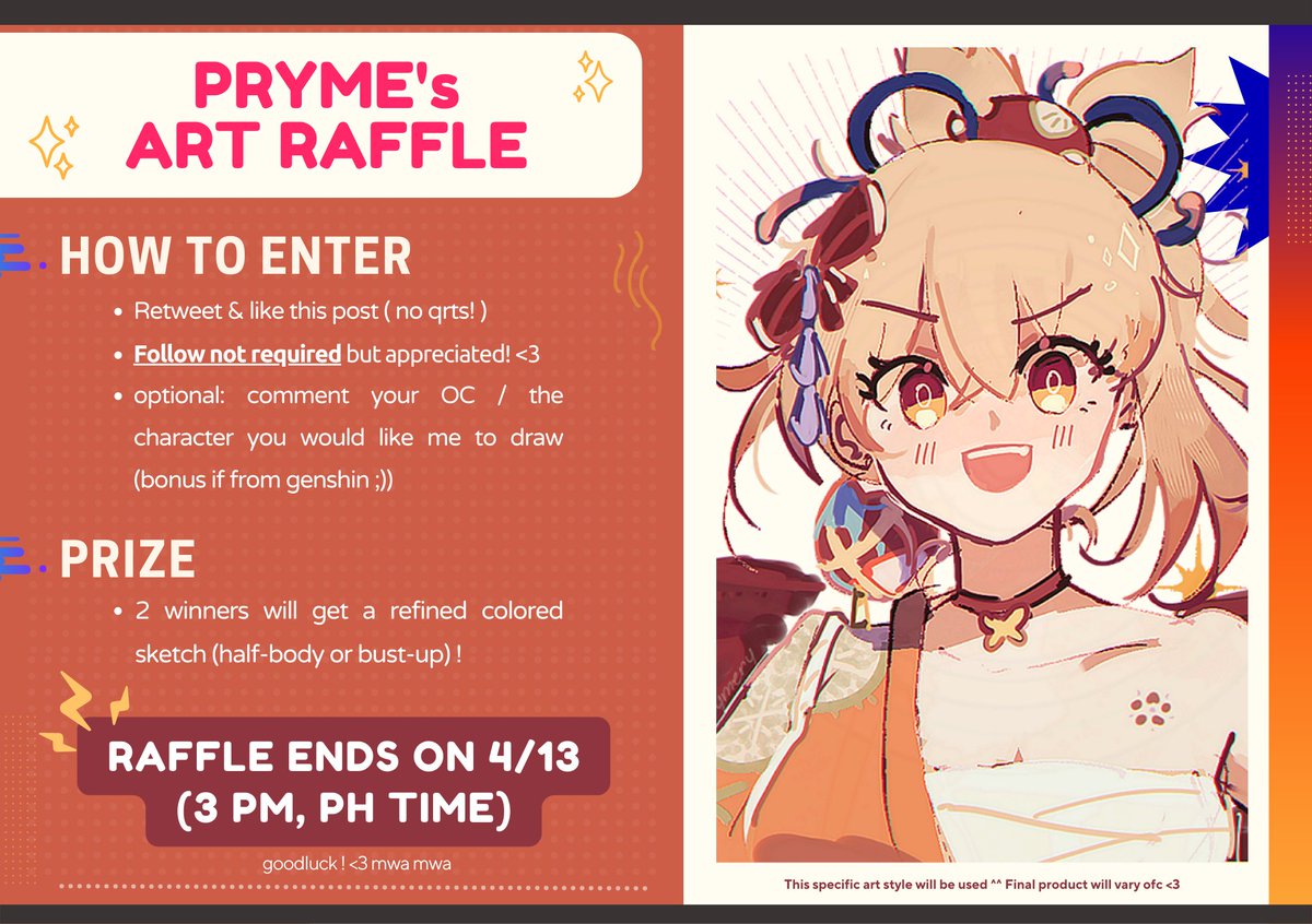 ‼️ PRYME'S ART RAFFLE 🎉 thank u all so much for 8k i love u all 🥹🫶 with that, ill be opening my first #artraffle! hehe 🥳 RULES! — Like & RT — Follow not required but appreciated ! — Optional: comment your OC / the character you would like me to draw — Ends on 4/13, PH time