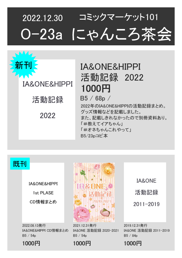 6 6 西1ホール a 31a 『にゃんころ茶会』 設営完了しました。 新刊『IA&ONE 活動記録2020−2021』 B5/54P/1000円 既刊『IA&ONE 活動記録2011-2019』 B5/84P/1000円 各種キャッシュレス決済使用可能です。 #C99A 21/12/31 08:45