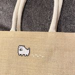 無印のジュートバッグにUNDERTALEのうざい犬刺繍しました🪡 持ち手のど真ん中に来て欲しかったんですが、犬が歩いちゃったのでズレました。 #UNDERTALE #アンダーテール
