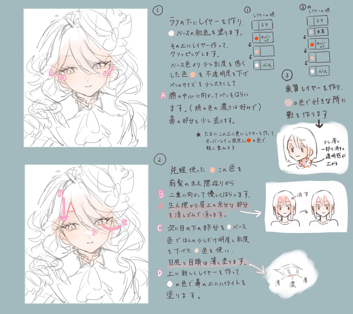 肌と目のメイキングです!! 説明するのが苦手なのでよく分からなかったらすみません😭 髪の塗りは決まった塗り方がなくて説明が難しかったのでまたどっかの機会で紹介出来たらいいなと思います😢