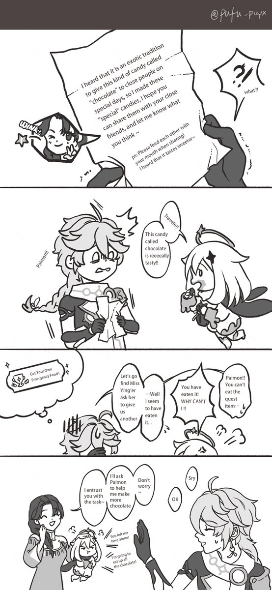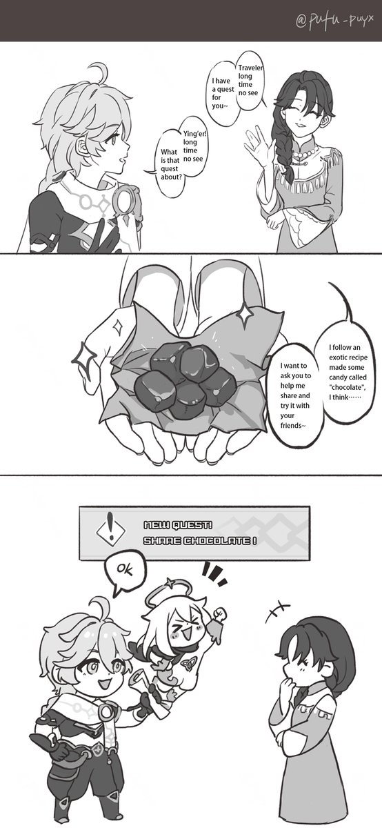 I made up a little quest for Aether~It's about Chocolate Kisses 😉😉 ps: I couldn't drawing all chapter in time, have to post it in few days……🥲 #ValentinesDay #genshinimpactfanart #Aether