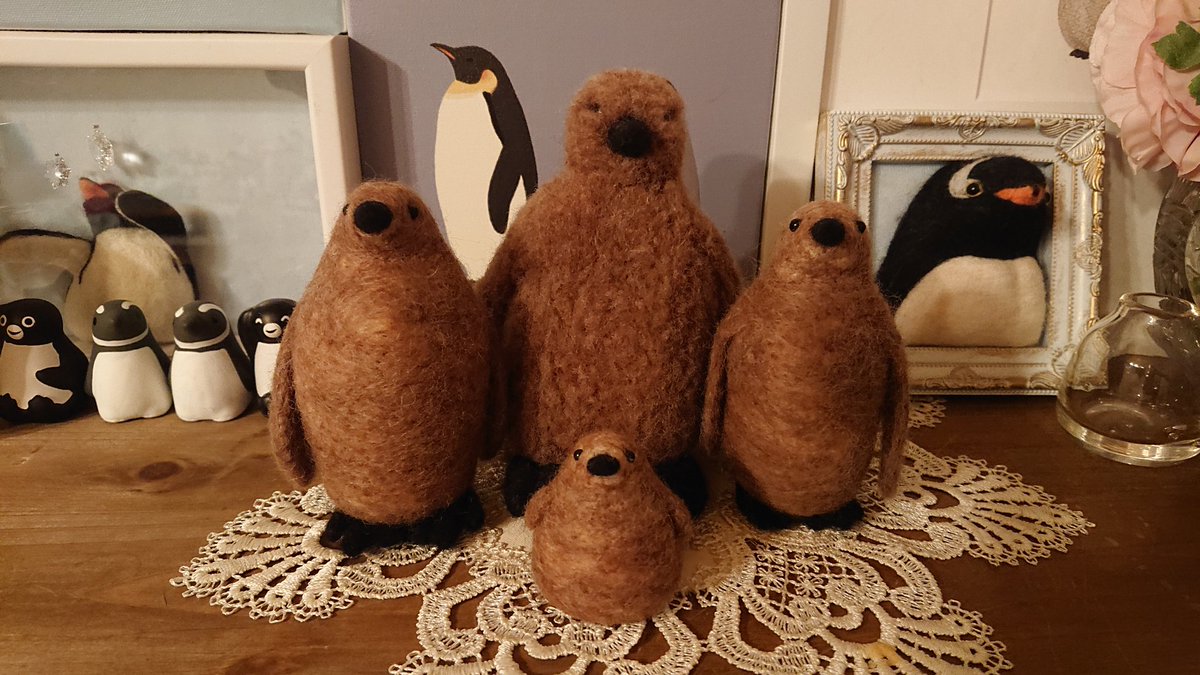 パパお腹すいたよ~💦 こぺん軍団の1人は以前作ったエンペぱぱと並べた時に餌の催促をしてる様なポーズをイメージしています✨ 並べて自己満足浸る午後ですw #羊毛フェルト #エンペラーペンギン #皇帝ペンギン