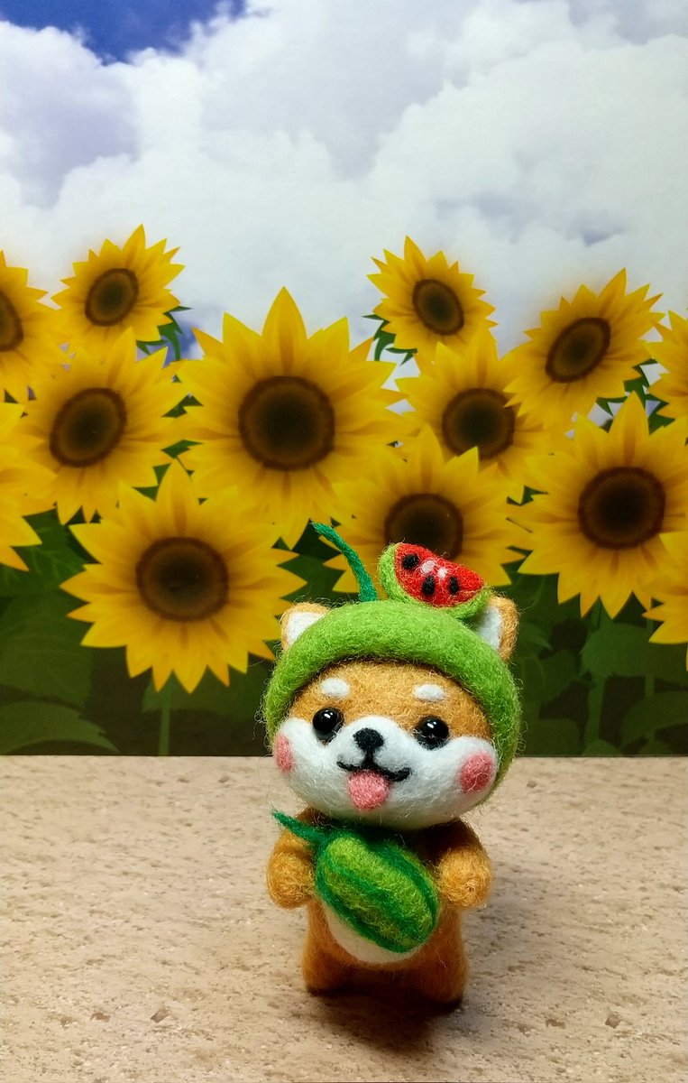 残暑見舞い申し上げます🍉🍧🎐 スイカ茶柴🐶ちゃん完成🙌 ①動物ほっかむりじゃなくてラクそうに見えて🍉が小さくて目がショボショボ(∋_∈)しました😂 ②スイカ黒柴🐶ちゃんとスイカ🍉隊結成😆 黒柴ちゃんは約1年前作品 見本よりデカくなった😂 ちょっとは上達した気がする😁 #羊毛フェルト